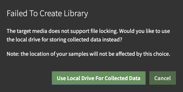 When creating a new library in a file-system without file-lock, it’s a similar situation. Here, you might encounter the following dialog: